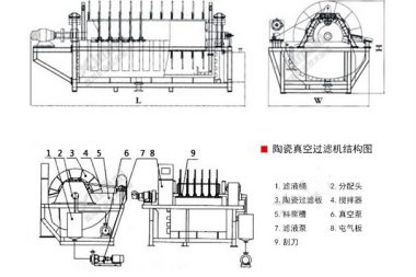 Ceramic vacuum filter mainly consists of roller system, mixing system, feeding and discharging system, vacuum system, filtrate discharge system, scraping system, hair washing system, combined cleaning (ultrasonic cleaning, automatic acid cleaning) system, automatic control system The tank body and the frame are composed of several parts.