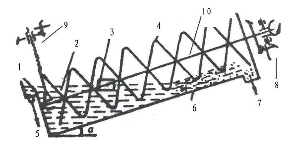 The milled pulp is fed into the flume from the inlet and outlet in the middle of the subsidence area. Under the inclined installation flume is the slurry grading subsidence area. The spiral rotation at low speed can mix the pulp, suspend the fine particles to the top and overflow the overflow weir. Coarse particles sink to the bottom of the trough and are spirally conveyed to the discharge outlet for sand return. The position of overflow weir is higher than the bearing center of the lower end of spiral shaft and lower than the spiral upper edge of overflow end. The automatic lifting device for sand return is added to the sand return end, which can cancel the configuration of the large spoon head of the ball mill and make the ball mill run more smoothly.。
